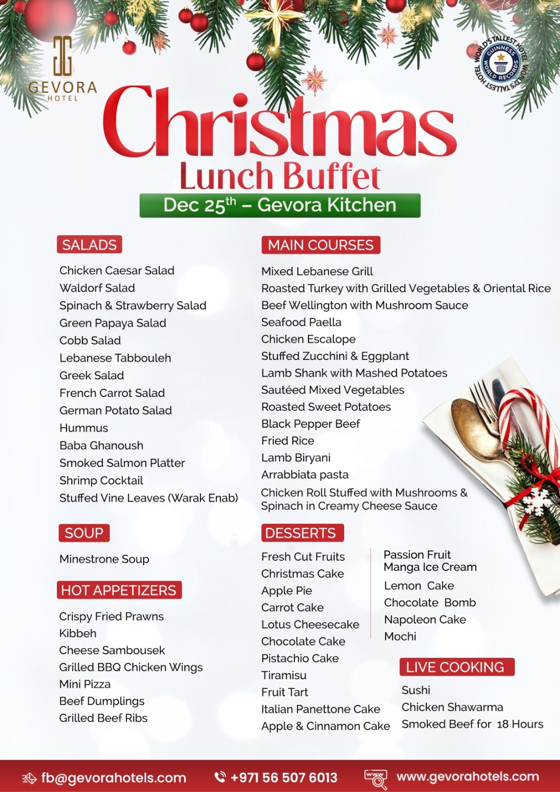 • Celebrate Christmas like never before at Gevora, The World's Tallest Hotel! Enjoy a festive lunch buffet filled with holiday favorites, magical ambiance, and breathtaking views. Gather your loved ones and make this holiday season unforgettable—all from just AED currency symbol 110!